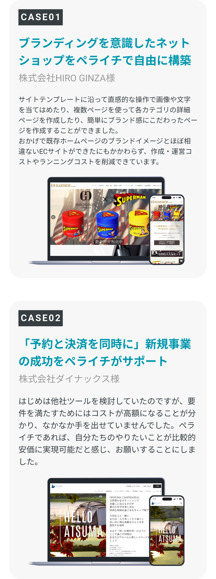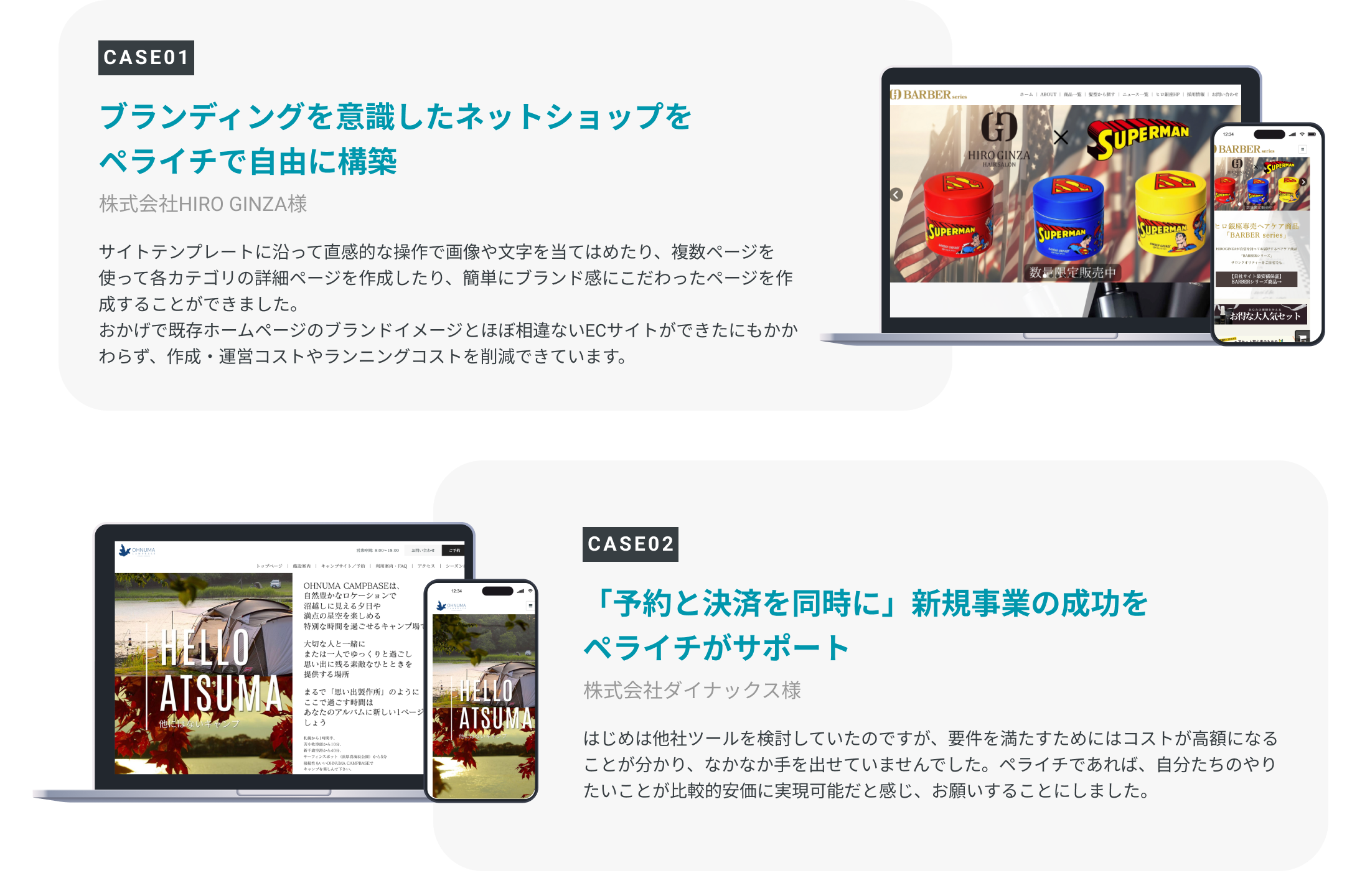 会員登録をしてから実際に商品を販売するための設定が完了するまで、 その日のうちに完結することが出来ました。 業種別のデザインテンプレートも豊富に用意されているため、 少しのカスタマイズで思い通りの販売ページが作成できました。
