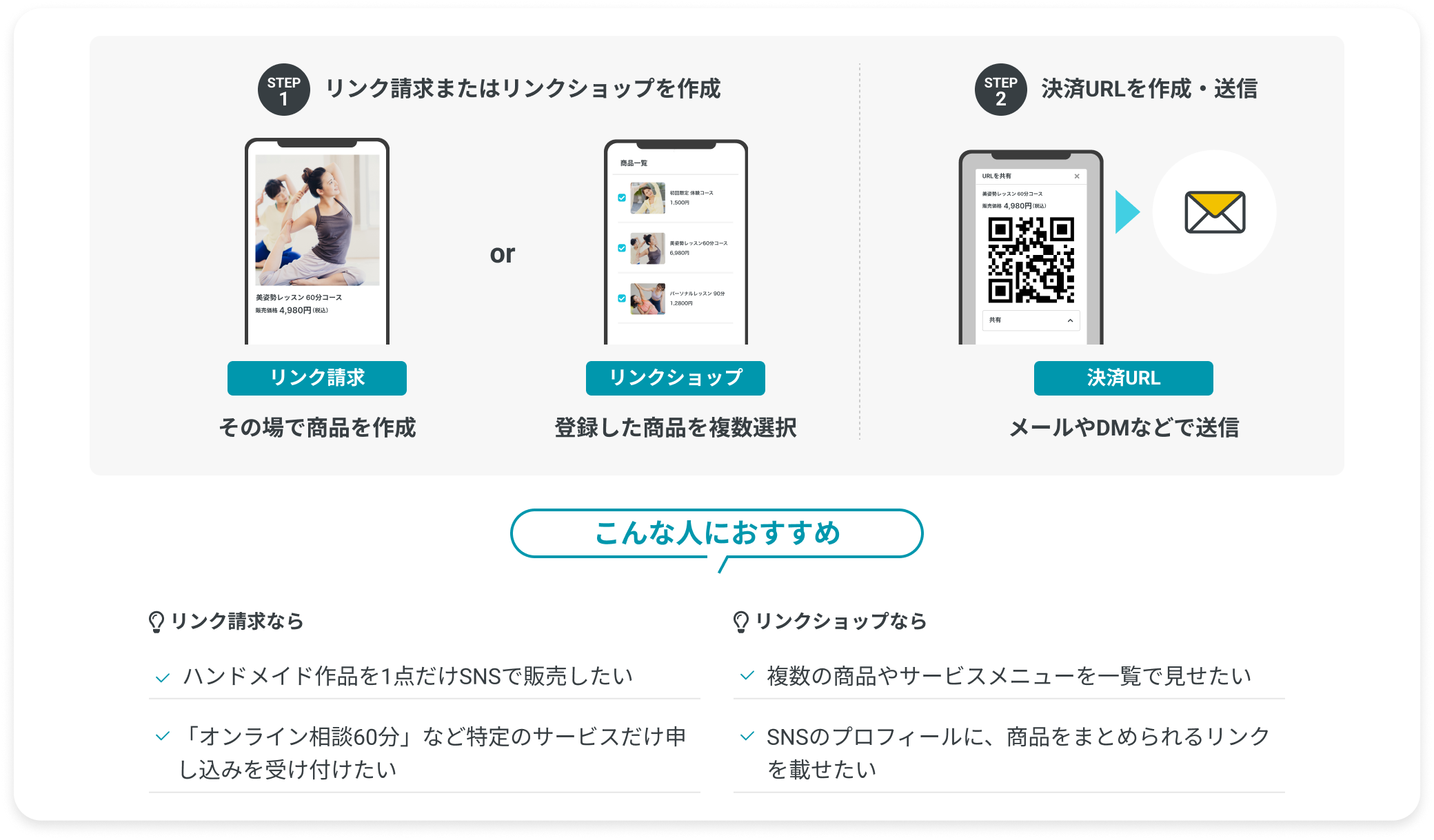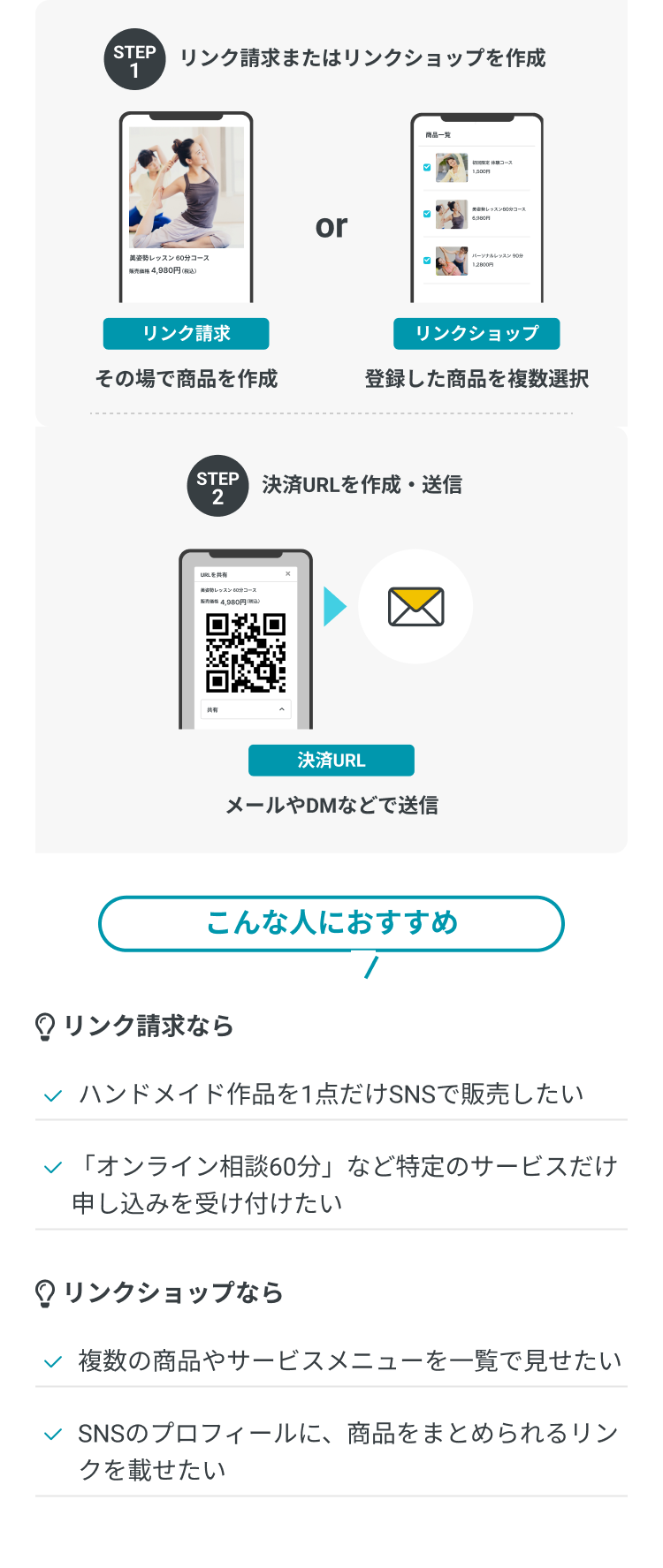 ページを作成しなくてもサービスを販売できる「リンク請求」の機能を利用しています。 InstagramやLINEなどで、お客さま毎に個別に設定した金額で代金を回収できるので、 振込確認などの手間から解放され、工数を削減することができました。